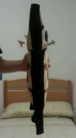 es de unos 7 cm de alto por unos 4-5 de ancho, los materiales son felpa y algodon.